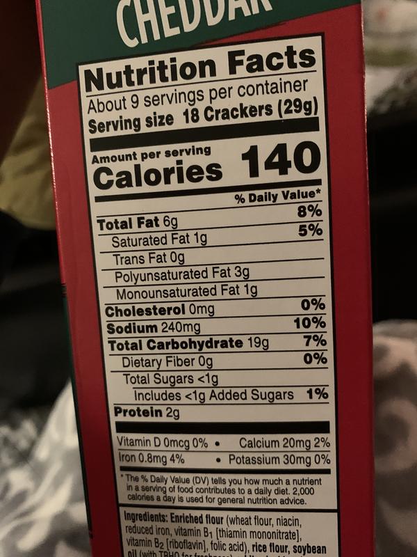 White Cheddar Cheez Its: The Best Snack Around? Trans fats are small enough that they are not required to be listed on nutrition labels. The Green Company of Dayton sold the first cheese crackers in May 1921. ... 17 grams of net carbs, seven grams of fat, three grams of protein, and 150 calories. White Cheddar Cheez Its Serving Size. A serving size of white cheddar cheez its is 28 grams, or ...