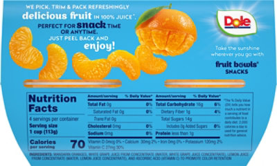 Dole Fruit Cups Tropical Fruit in 100% Juice - 4 ct - Giant Per Serving: 60 calories; 0 g sat fat (0% DV); 5 mg sodium (0% DV); 13 g total sugars. 27 mg vitamin C (30% DV). Excellent source of vitamin C. Non-GMO (No ... Dole Fruit Bowls - Cherry Mixed Fruit in 100% Juice - H-E-B Dole Fruit Bowls - Cherry Mixed Fruit in 100% Juice ; Cholesterol, 0mg, 0% ; Sodium, 0mg, 0% ; Potassium, 0mg, 0% ... Dole Fruit Cups, Mixed Fruit: Calories, Nutrition Analysis & More Personalized health review for Dole Fruit Cups, Mixed Fruit: 80 calories, nutrition grade (C plus), problematic ingredients, and more. Learn the good & bad for ...