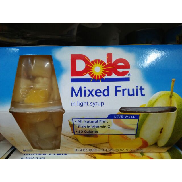 › foods › Fruit+Cups+Mixed+Fruit+In+Light+SyrupCalories in Dole Fruit Cups, Mixed Fruit In Light Syrup - Fitbit Comprehensive nutrition resource for Dole Fruit Cups, Mixed Fruit In Light Syrup. Learn about the number of calories and nutritional and diet information for Dole Fruit Cups, Mixed Fruit In Light Syrup. This is part of our comprehensive database of 40,000 foods including foods from hundreds of popular restaurants and thousands of brands.