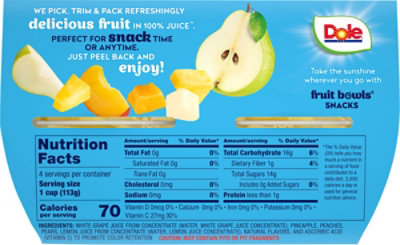Dole Fruit Bowls Mixed Fruit in 100% Fruit Juice, 4 Oz Bowls, 4 Cups of ... Calories per gram: Fat 9 • Carbohydrate 4 • Protein 4 . Product details. ... Now you can easily enjoy more fruit and sunshine every day in a convenient fruit in a cup. DOLE FRUIT BOWLS Mixed Fruit in 100% Juice are made from the best sun-ripened fresh fruit that nature has to offer, and are non-GMO and gluten free. ...